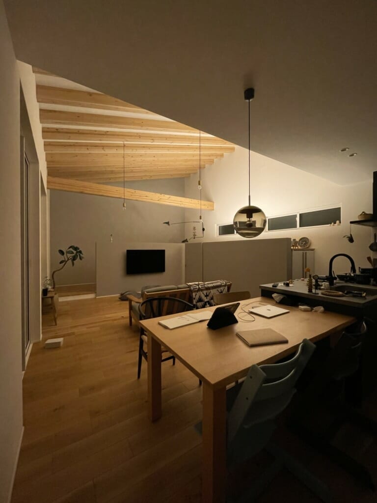 ダイニングテーブルの上だけ天井を下げていることも、 広い空間をより広く感じられるポイントかなと思います。 狭めのリビングにはメリットもあって、 ・お掃除がラク ・冷暖房が効きやすい ・家族の存在感を程よく感じられる ・モノがあふれにくい ・大きいテレビを買わずに済む(笑) などがあります。 空間を区切りすぎないことや、視線の抜けを有効活用する、などの工夫で 単なる数値にとらわれない、 自分達にとってちょうどいい空間づくりができるんだなと知りました。